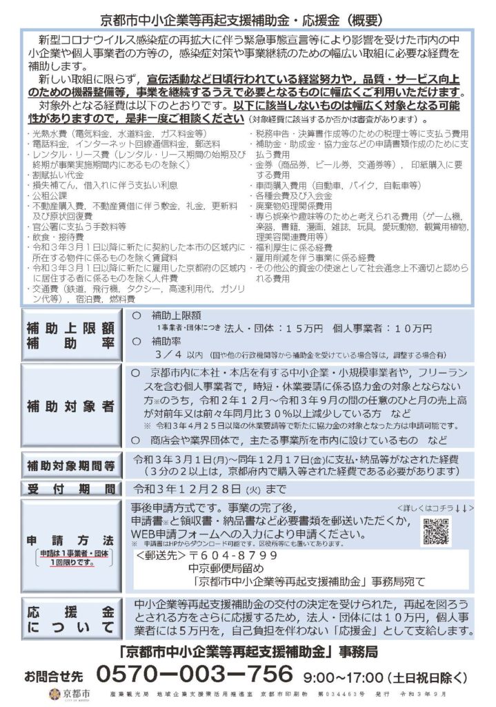 この度,京都市では,「京都市中小企業等再起支援補助金」(以下「再起支援補助金」という。)の交付対象者に,「京都市中小企業等再起支援補助金「応援金」」(以下「応援金」という。)を支給することとしますので,お知らせします。