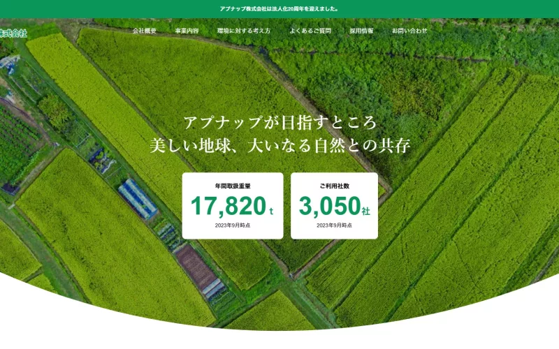 アプナップ株式会社様は「安心して暮らせる環境作りのために」というテーマのもと、環境への深い配慮と資源の有効活用を通じて、持続可能な社会の実現を目指されています。
