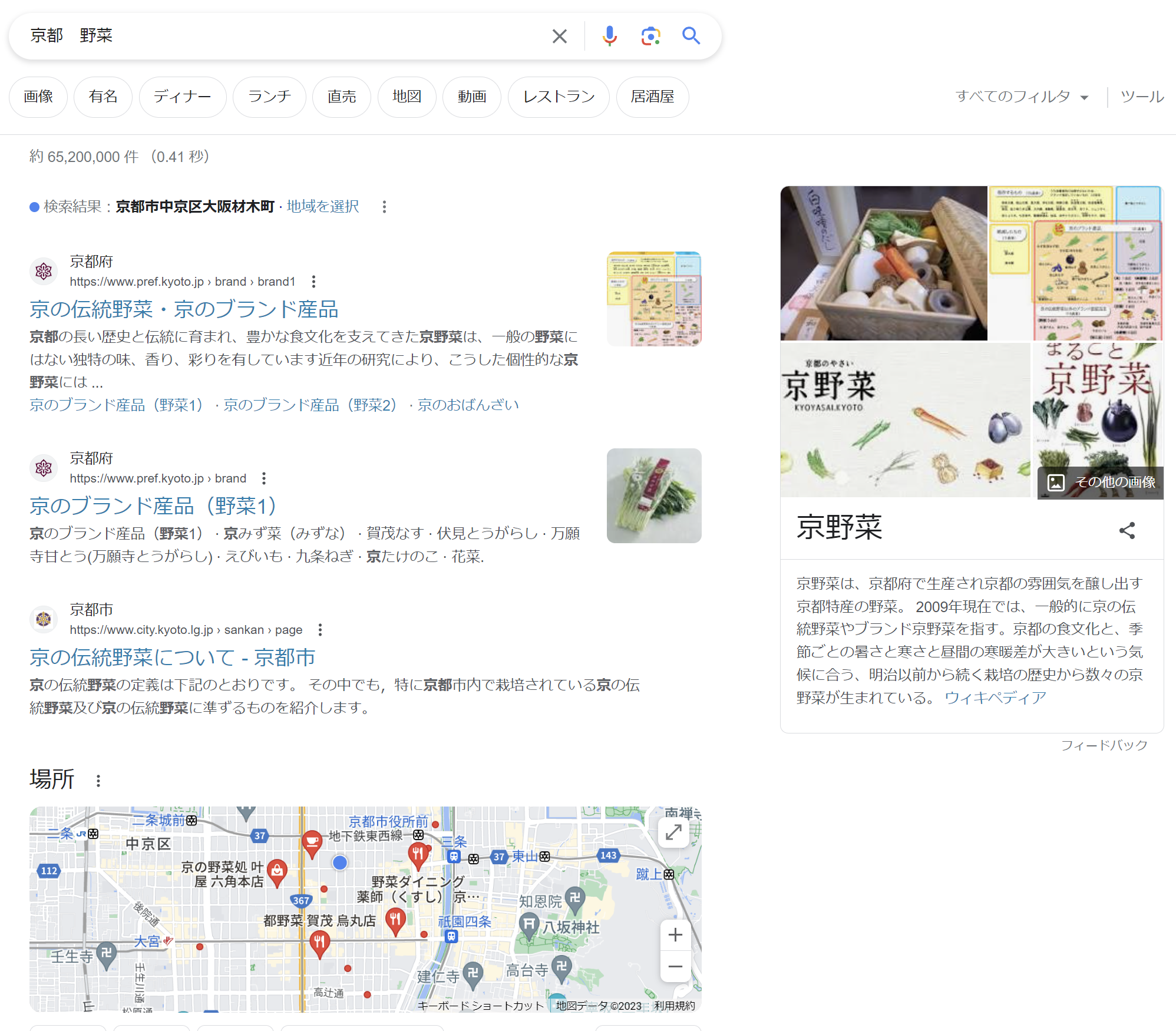 「京都 野菜」で検索を行うと、京野菜に関する基本情報が表示、次に京野菜を扱う料理店情報(マップ)が出てきます。