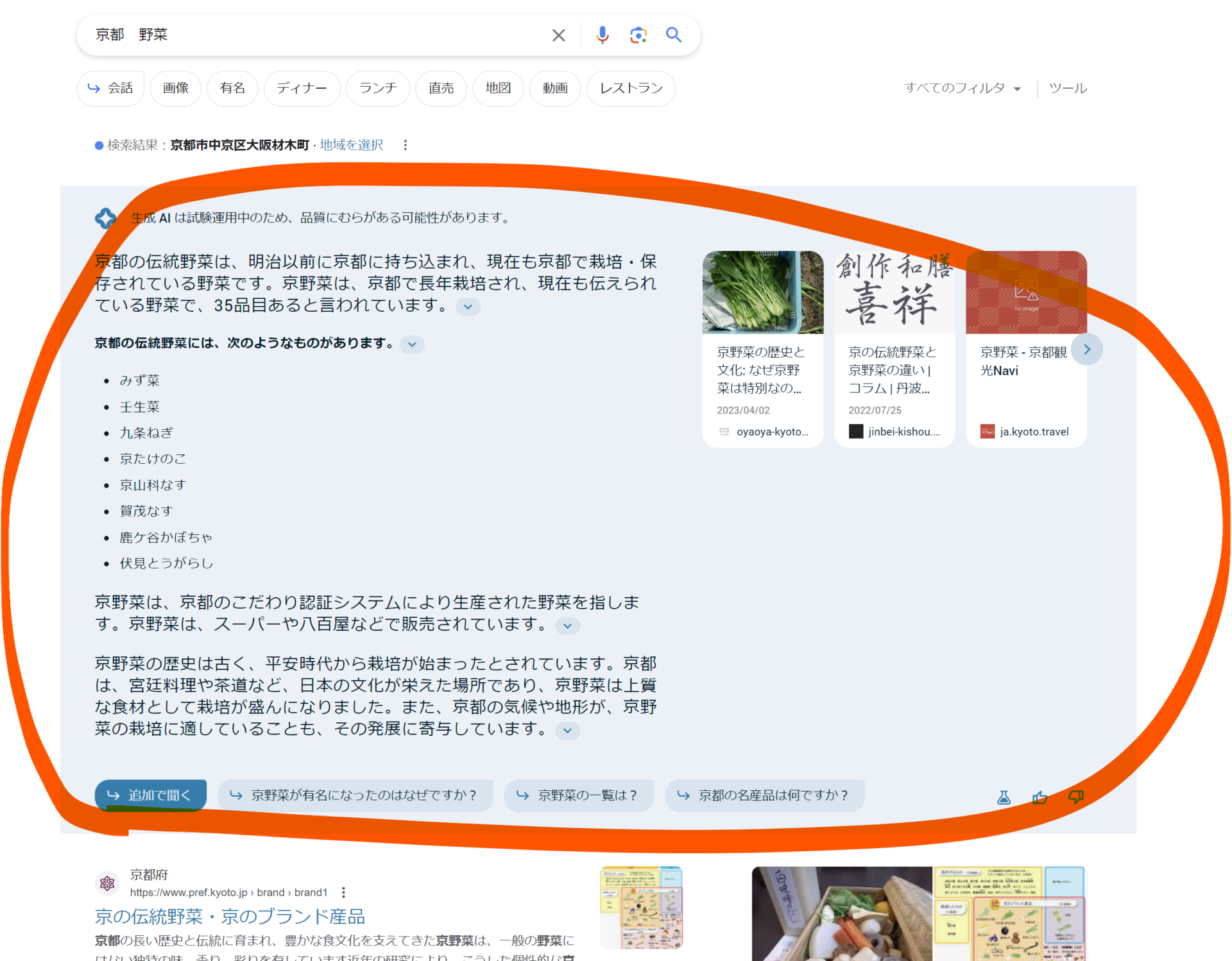 「京都 野菜」で検索を行うと、グーグルの生成AI(bard)が、京野菜に関する情報を要約して表示します。色んなリンク先を訪問する必要が少なくなり、利用者の問題可決が早く行えるようになります。