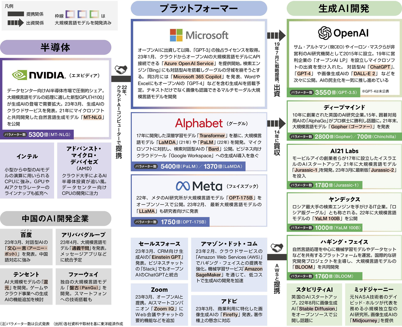 ChatGPTは右上の部分、私たちがよく使うグーグルは中央のAlphabetです。このマップ、名だたる企業が参画してますね。