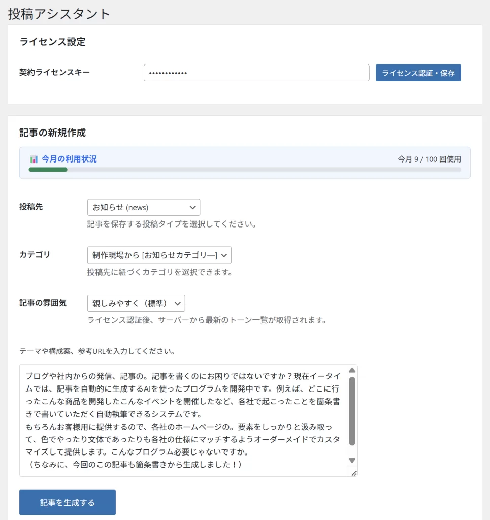このプログラムは、まるで優秀なライターがあなたの会社の隣にいるかのように、記事作成をサポートします。例えば、「先日、〇〇イベントを開催しました」「新商品〇〇を開発しました」「〇〇地域に出張しました」といった、日々の出来事を箇条書き・短文で入力するだけでOK!