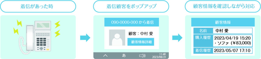 固定電話とPCを繋げることによって、着信があった時PCに顧客情報やこれまでの取引履歴を表示できるシステムのことをいいます。